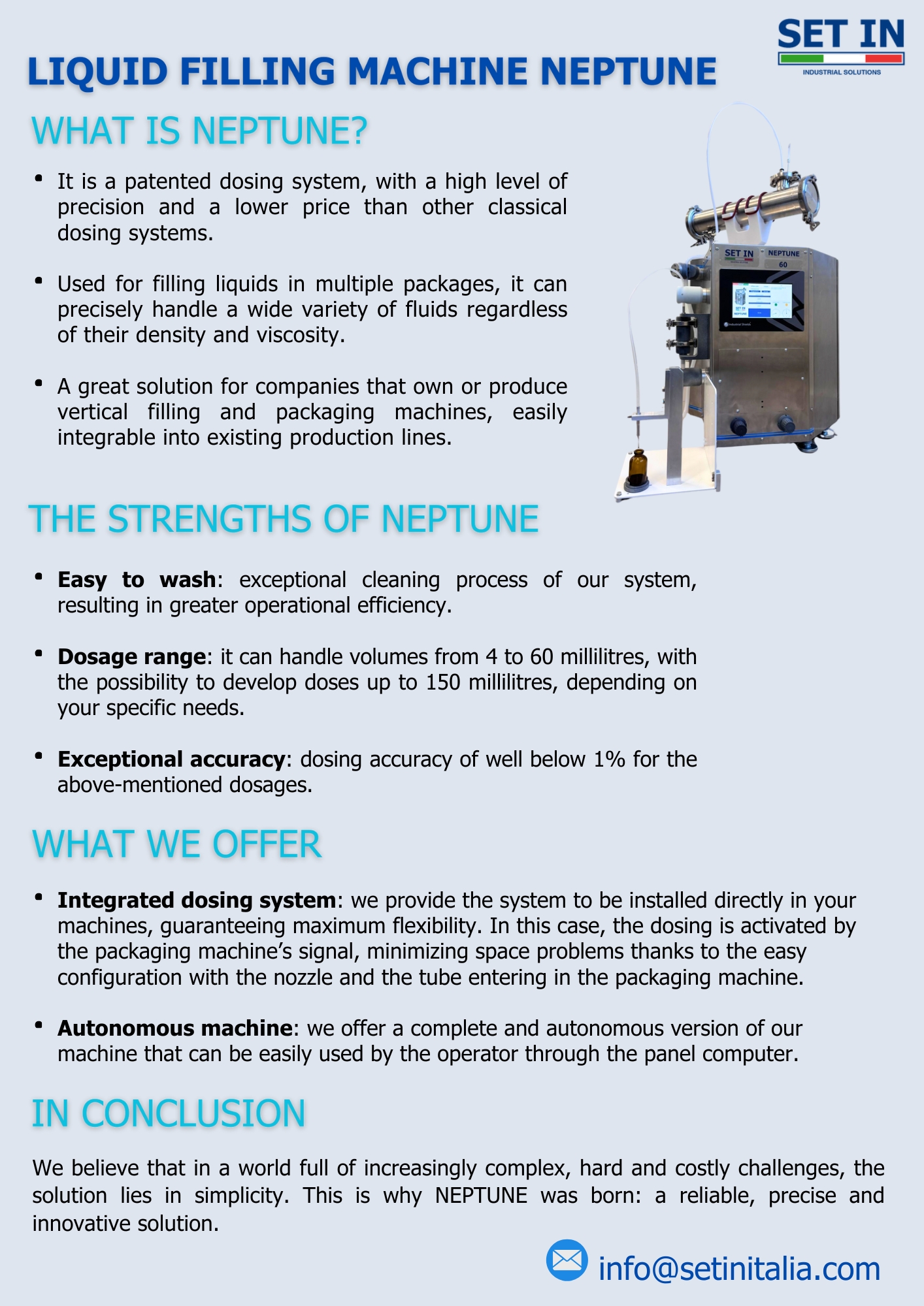 NEPTUNE is our first modular machine: a patented dosing system, with a high level of precision and a lower price than other conventional dosing systems. Particularly suitable for the pharmaceutical, food and cosmetic sector, Neptune doses any type of fluid regardless density and viscosity.